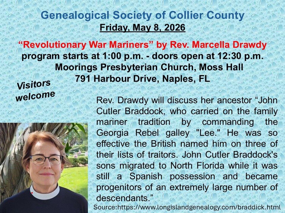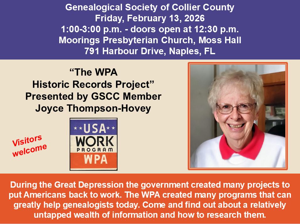 Members of the Genealogical Society of Collier County have submitted their family surnames to our Surname Project, which is now a searchable online database. Anyone may contact the submitter by clicking on the surname of interest. Members can also submit their surnames online for addition to the database. CLICK HERE to find out more.