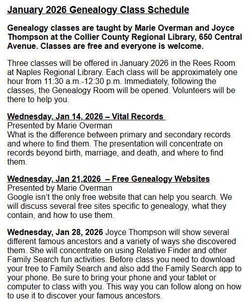 If you need help, the Genealogy Room at the Naples Regional Library at 650 Central Avenue is open Monday through Thursday from 1-3 pm. See the schedule for details. https://thegscc.org/volunteer-help/